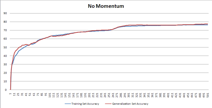 As you can see from the graphs the BPN will usually converge a lot faster with momentum added than without it and it also has the added benefit of allowing the back-propagation to avoid local minima’s in the search space and to traverse areas where the error space doesn’t change. This is evident from all the fluctuations seen in the graph.