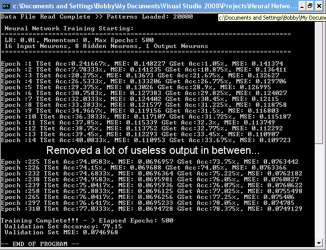 So in our case we have this massive data set of 20000 patterns (entries), we can’t just stick all of the data into our network since the network will learn that data and we have no way of checking how well the network will do with unseen data. This problem is referred to as over-fitting, basically the network starts remembering the input data and will fail to correctly handle unseen data. I don’t want to go into too much detail here as this is something of an advanced research topic. Once you are familiar with neural networks you can read up on over-fitting on your own.