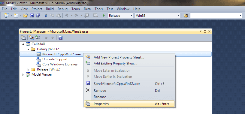 Step2: Expand the project/configurations tree and select the “Microsoft.Cpp.X.user” user file. Right click and select “Properties”.