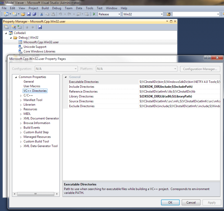 They removed the global VC path system accessible through the options dialog and have opted for a per-project path system with several global user files. This mean that for every single project that you make that uses the DX API you will need to add in the DX SDK directories manually via the project properties -> VC++ Directories (I’d personally recommend this technique since it allows projects to be more portable) but if you are lazy, you can add the SDK paths to the default c++ project settings template stored in the glocal cpp user file. This is done as follows: