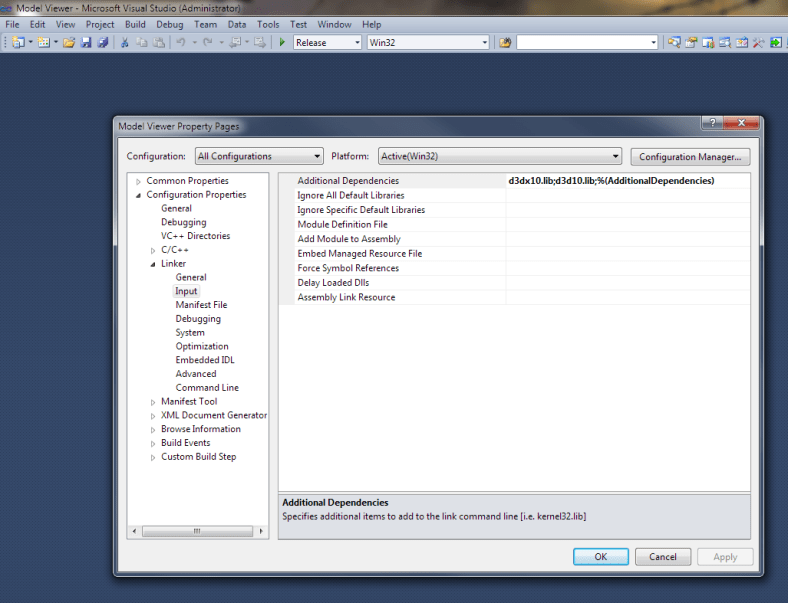 Step2: Expand the “Linker” section and select “Input” and under “Additional Dependencies” add the necessary lib files (D3D10.lib & D3DX10.lib).