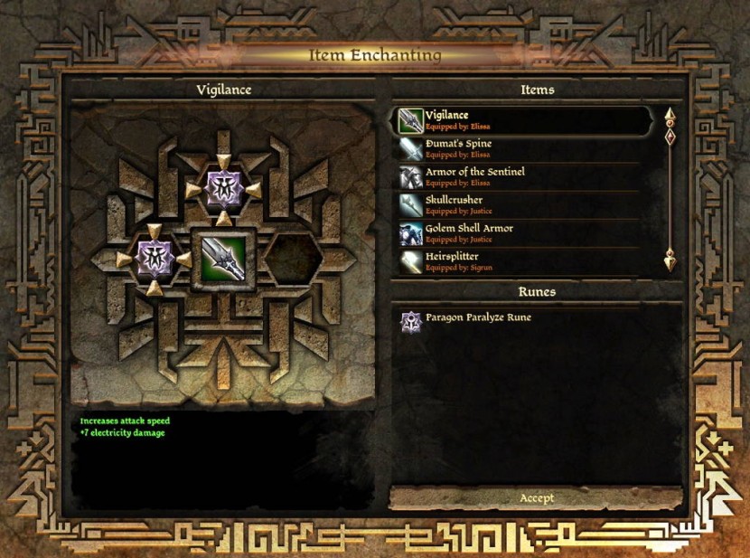 Dragon Age was also a game that did it right, it offered the option to enchant the best weapons in the game with elemental DMG, chance to stun, paralysis, etc… Further improving the weapons. The armor runes and rune crafting was introduced in the Awakening expansion but I felt that things got a little to complicated with having to manage numerous ingredients, recipes and so on… I’m straying from the point which is that in DA, you could find the best long sword in the game (for example starfang) and make it even better.